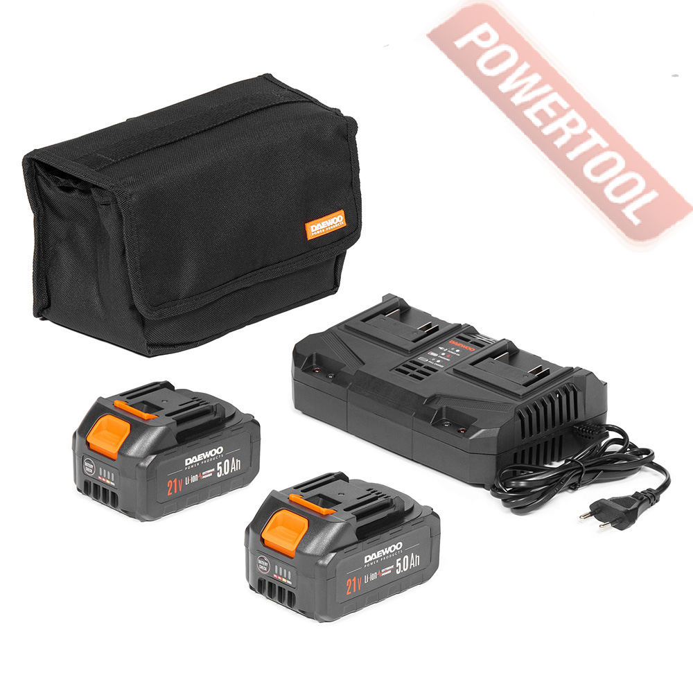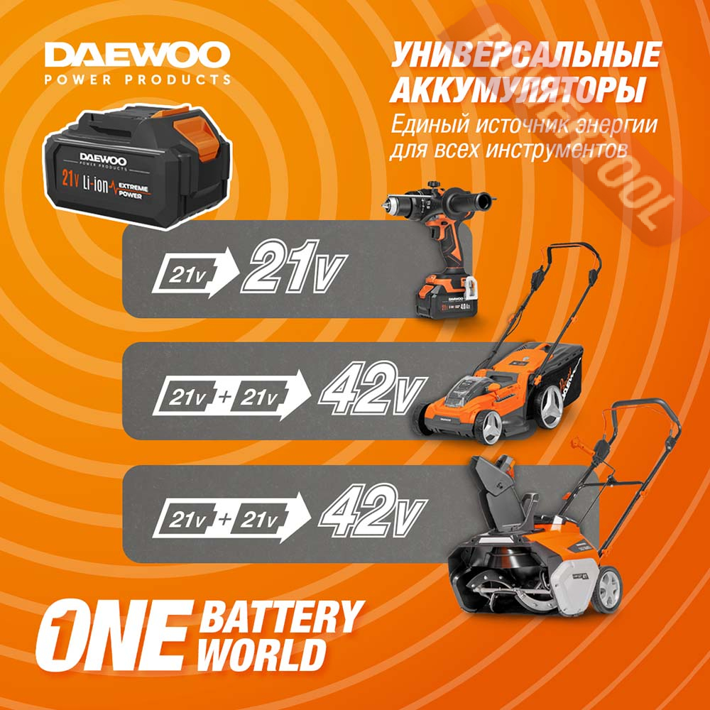 - 21В Li-ion единая платформа. Модель совместима со всеми аккумуляторными инструментами и батареями DAEWOO линейки 21В.