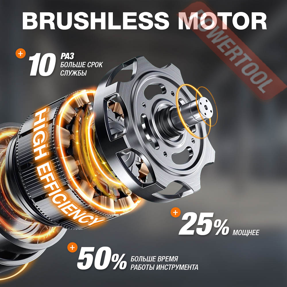 - Бесщеточный электродвигатель. Бесщеточный двигатель обеспечивает высокую мощность при меньшем потреблении энергии, что позволять работать до 30 процентов времени дольше на одном заряде аккумуляторов.