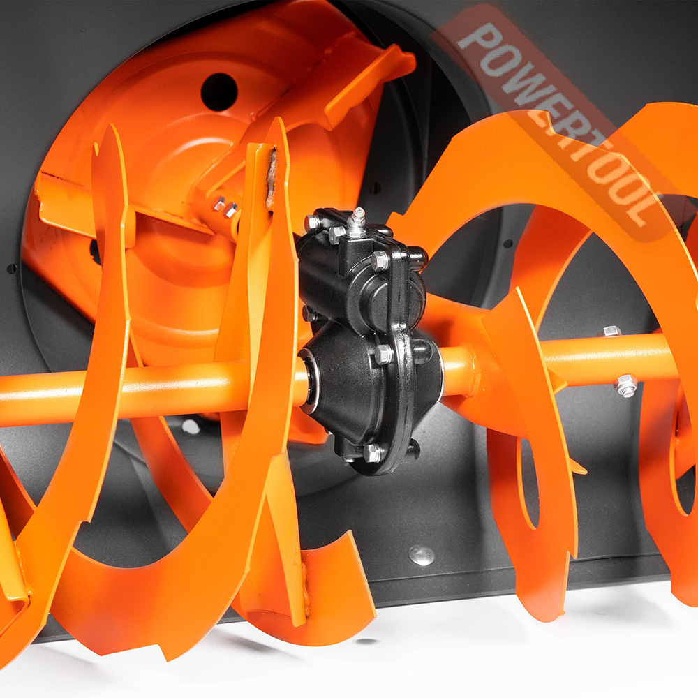 - Усиленный редуктор. Усиленный редуктор в паре со стальными опорами шнека с подшипниками передает до 95 процентов крутящего момента на рабочие узлы сборки и выброса снега. Выходной вал редуктора крепится на подшипниках большого диаметра, что обеспечивает высокую устойчивость механизмов к вибрации и ударам.