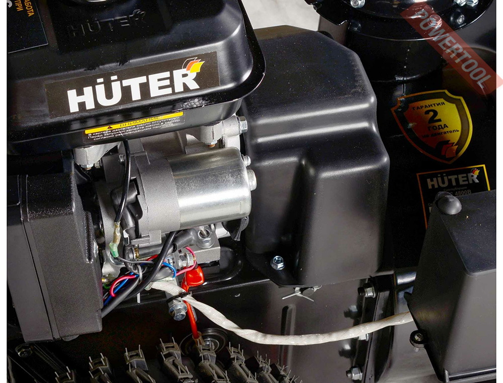 - Бензиновый 4-тактный двигатель Huter OHV объемом 196 куб.см мощностью 7 л.с с воздушным оxлаждением. Клапаны двигателя имеют верхнее расположение, что позволяет топливу сгорать почти без остатка и вырабатывать большую мощность, без образования нагара.