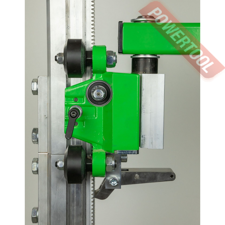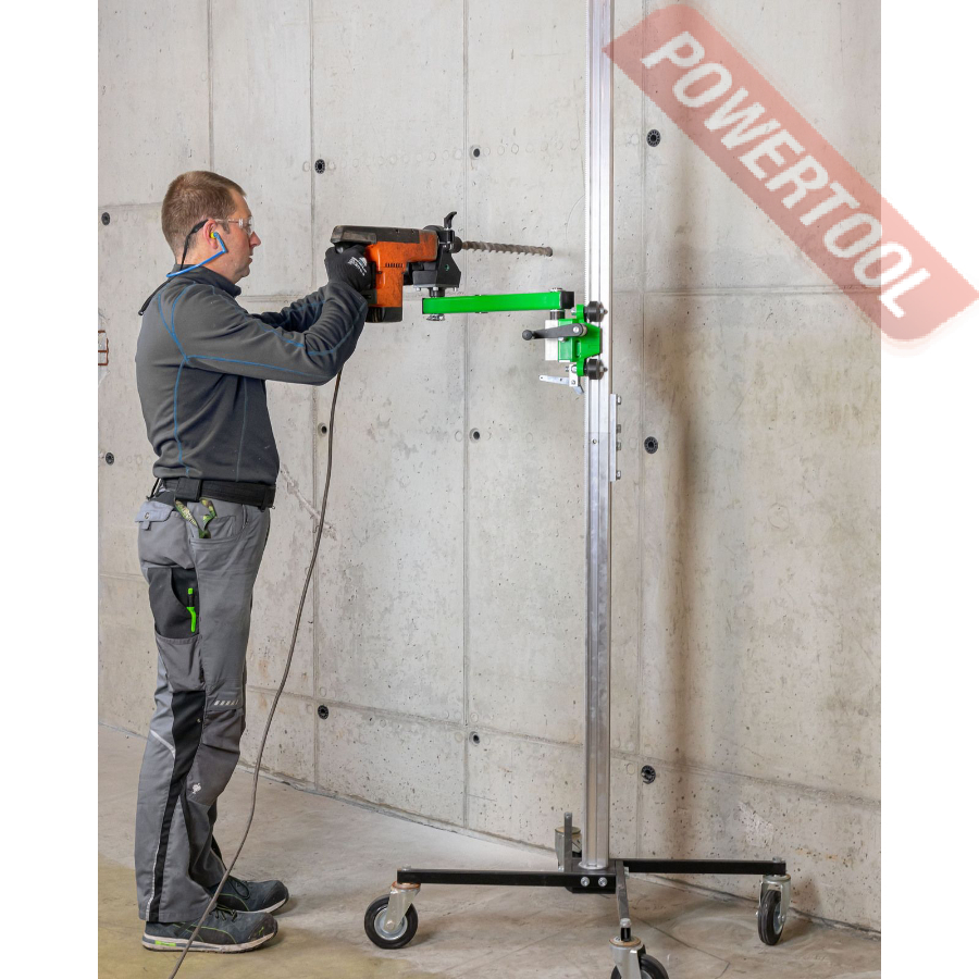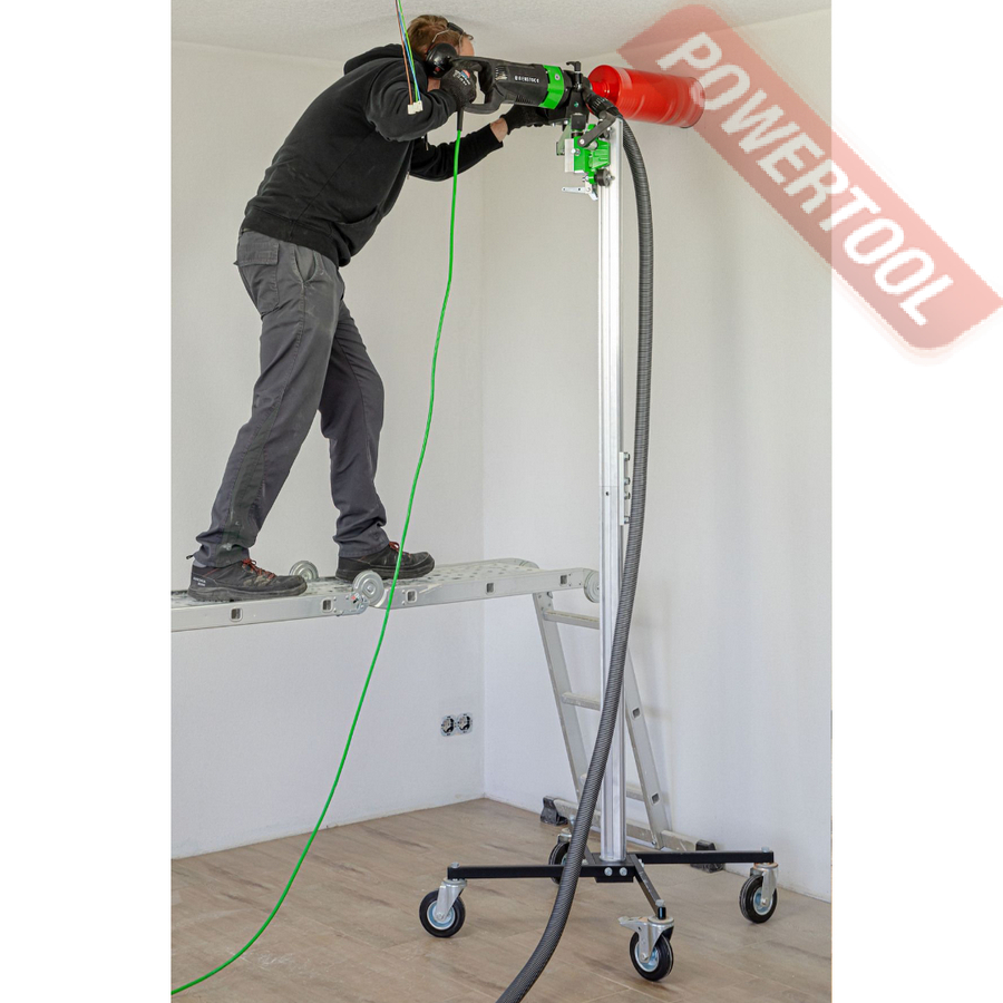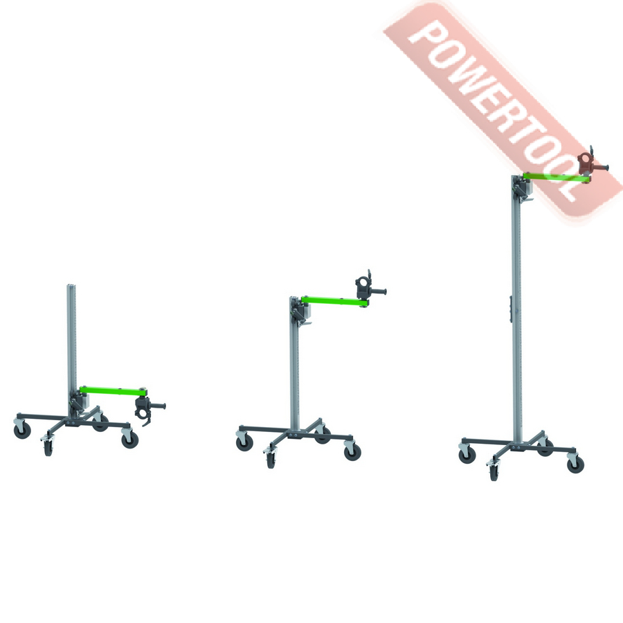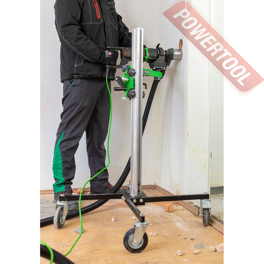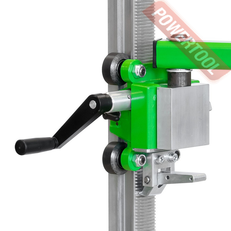 Стойка для алмазного сверления, max диаметр сверления коронкой 162 мм, прямая стойка 90 градусов, угол поворота 360 градусов, крепление мотора на хомут 60 мм, транспортировочные колеса, вес 24,5 кг, высота 1300 мм.