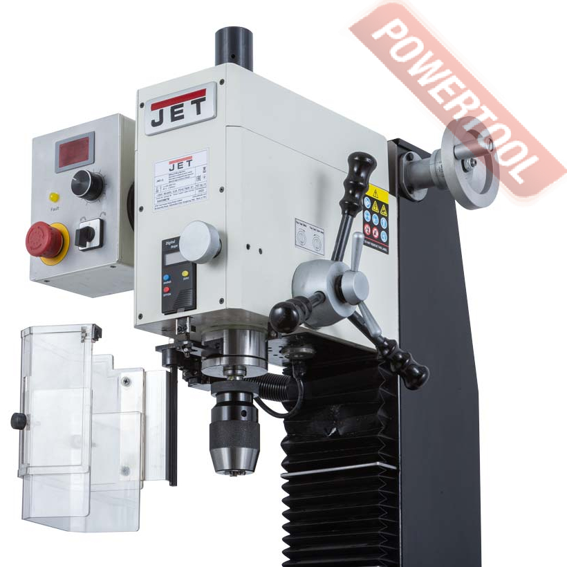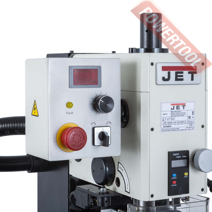 Моторная группа станка JET JMD-2L представлена коллекторным двигателем мощностью 750 Вт. Управление работой двигателя осуществляется с панели управления, расположенного с левой стороны сверлильной головки. Двигатель имеет плавную регулировку частоты вращения. Диапазон частоты вращения составляет 100-2000 об/мин и регулируется потенциометром. Включение реверса осуществляется переключателем стороны вращения шпинделя. Крестовый рабочий стол размером 595х140 мм перемещается по направляющим скольжения типа ласточкин хвост. Закрепление тисков и других зажимных приспособлений осуществляется с помощью 3-х Т-образных пазов размером 12мм и расстоянием между ними 35 мм.