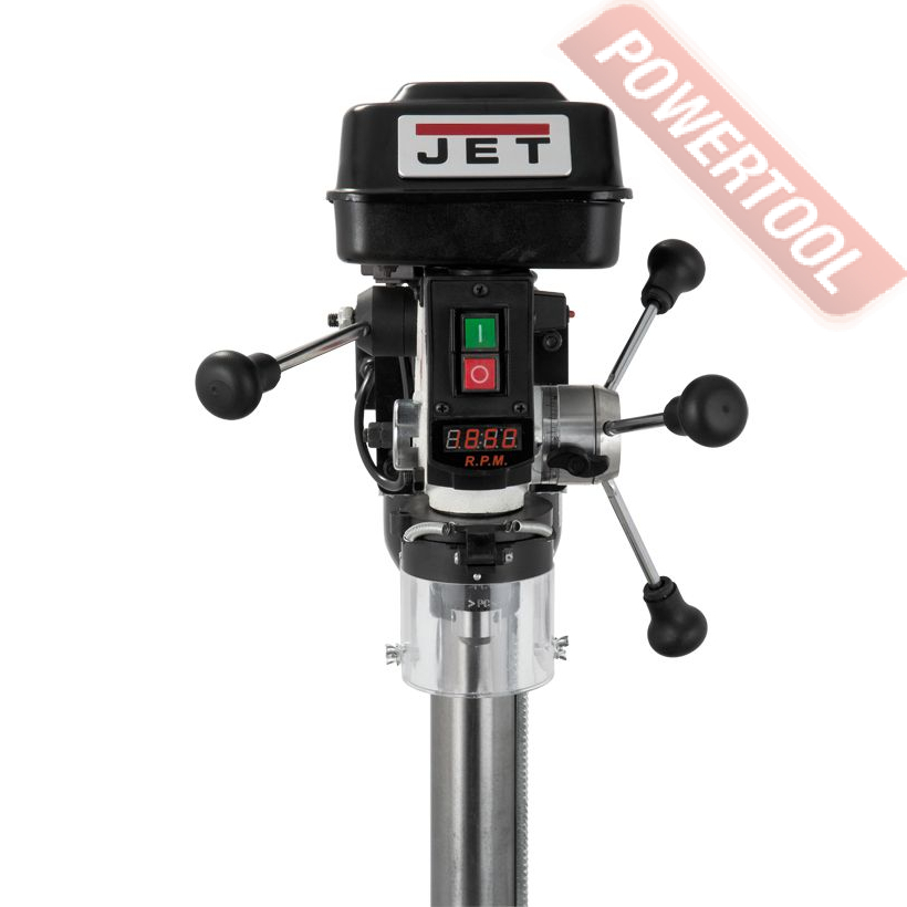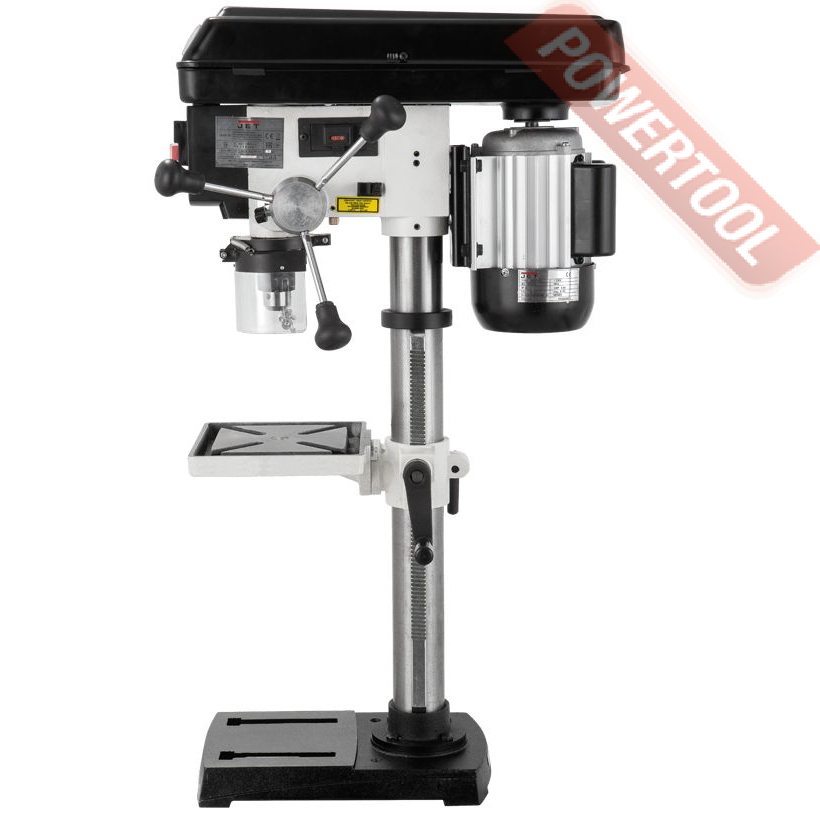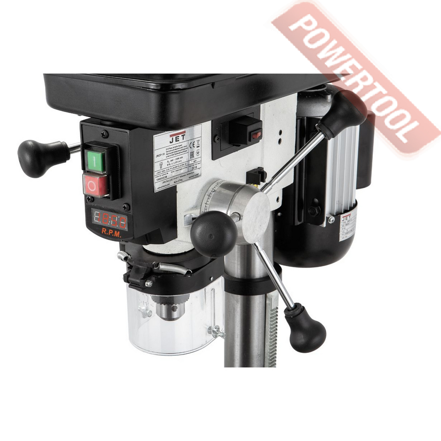 Сверлильный станок по дереву JET JWDP-10 с вариатором для работы в небольших мастерских с деревом, металлом и другими материалами. Его конструкция базируется на узлах и деталях профессиональной модели JWDP-12, но имеет ряд отличий: уменьшены общие размеры, изменено устройство стола, использован ключевой патрон и т.п. Эти меры позволили снизить стоимость при сохранении основных достоинств: частота вращения шпинделя меняется простым перемещением рычага управления, установленная скорость отображается на цифровом дисплее, штатная комплектация включает в себя лазерный указатель оси сверления, рабочий стол имеет Т-образные пазы для крепления тисков и прихватов, предусмотрена работа от основания.