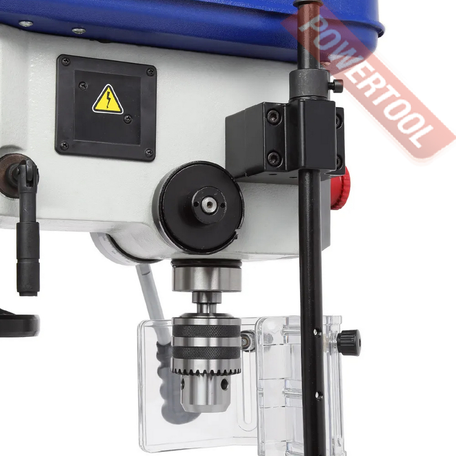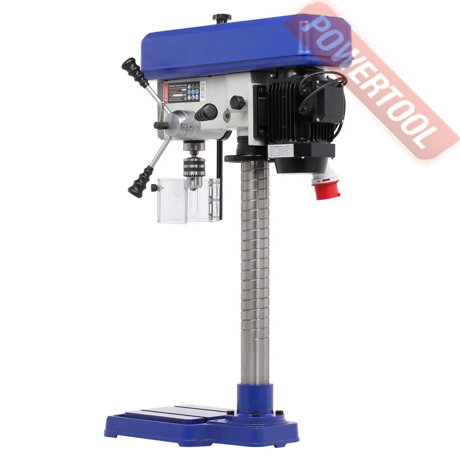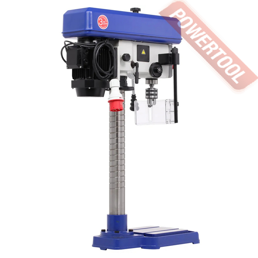 Сверлильный станок, 550 Вт, 380 В, max диаметр сверления 13 мм, частота вращения шпинделя 200-2400 об/мин, 5 скоростей, ступенчатая регулировка оборотов, посадочное сверлильного патрона B16, диапазон хвостовиков для патрона 1-13 мм, ход пиноли шпинделя 82 мм, вылет шпинделя 180 мм, шпиндель-основание 540 мм, диаметр стойки 70 мм, размер основания 490х310 мм, габариты ДхШхВ 645х500х960 мм, вес 60 кг, в комплекте патрон ключевой В16 1-13 мм, защитный экран, набор инструментов.