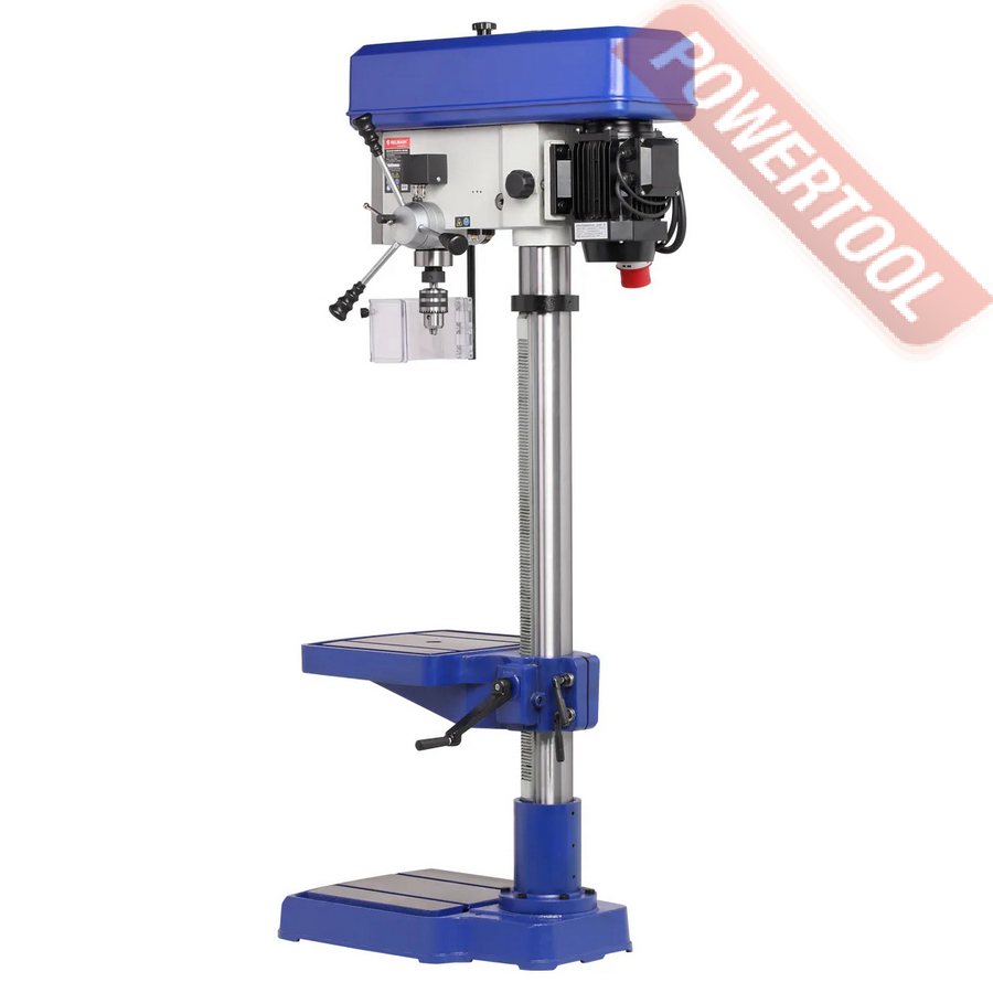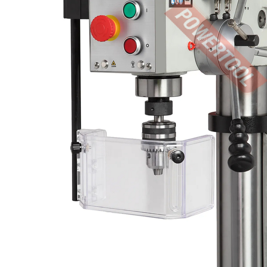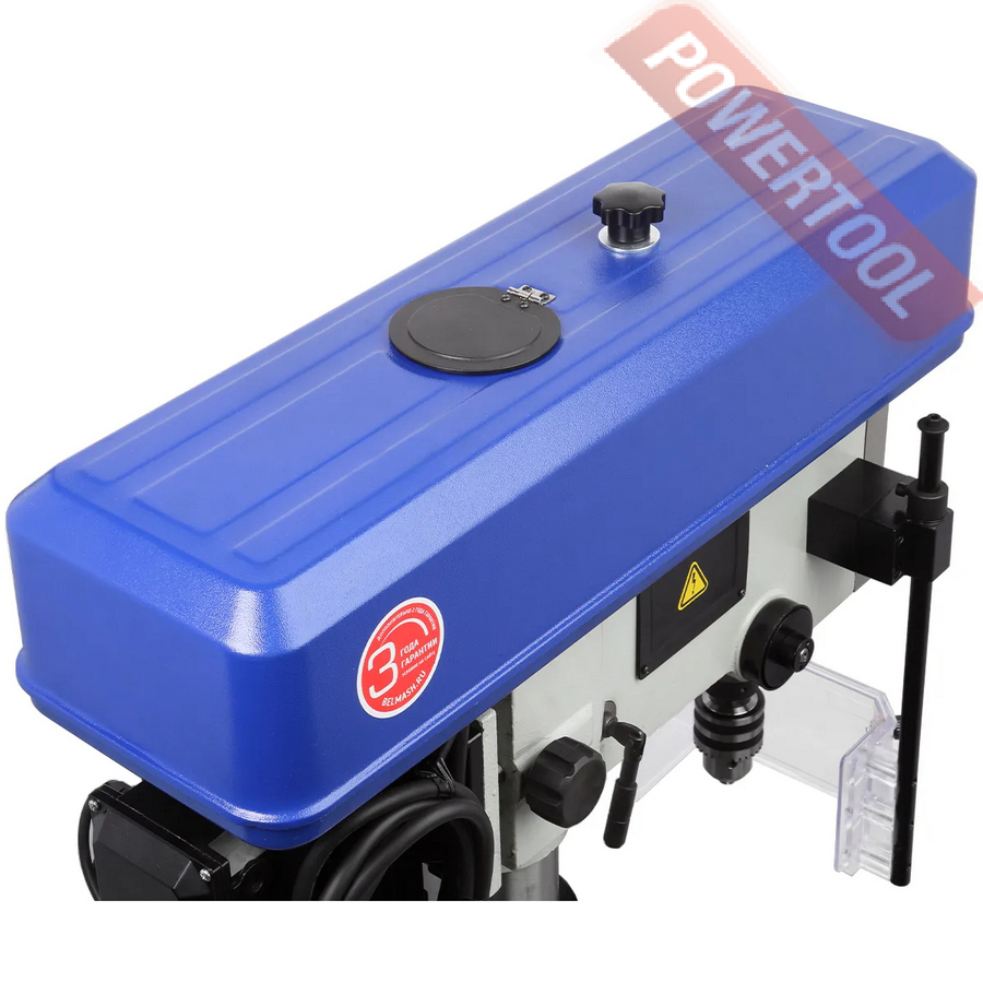 Сверлильный станок, 1100 Вт, 380 В, max диаметр сверления 32 мм, max нарезаемая резьба M16, частота вращения шпинделя 200-2250 об/мин, 5 скоростей, ступенчатая регулировка оборотов, конус шпинделя КМ-3, посадочное сверлильного патрона B16, диапазон хвостовиков для патрона 1-16 мм, ход пиноли шпинделя 135 мм, вылет шпинделя 245 мм, шпиндель-стол 855 мм, шпиндель-основание 1200 мм, диаметр стойки 98 мм, размер основания 650х440 мм, размер стола 380х410 мм, 2 Т-образных паза, подсветка рабочей зоны, лазерный целеуказатель, габариты ДхШхВ 840х730х1750 мм, вес 207 кг, в комплекте патрон ключевой В16 1-16 мм, оправка КМ-3/В16, защитный экран, набор инструментов, тиски.