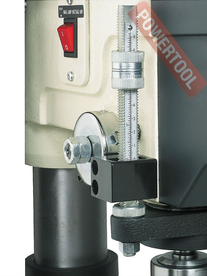 • Регулируемый ограничитель глубины сверления. Для контроля глубины сверления предусмотрена шкала с миллиметровой и дюймовой разметкой, а также регулируемый ограничитель.