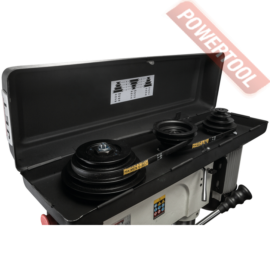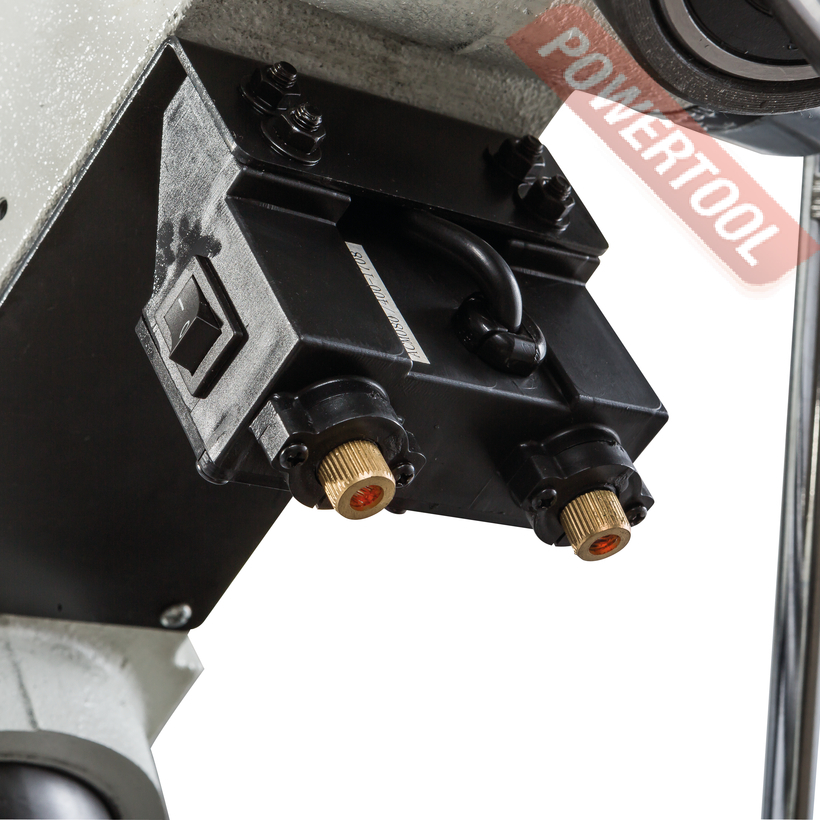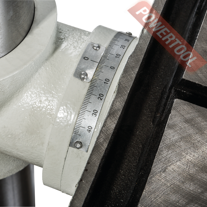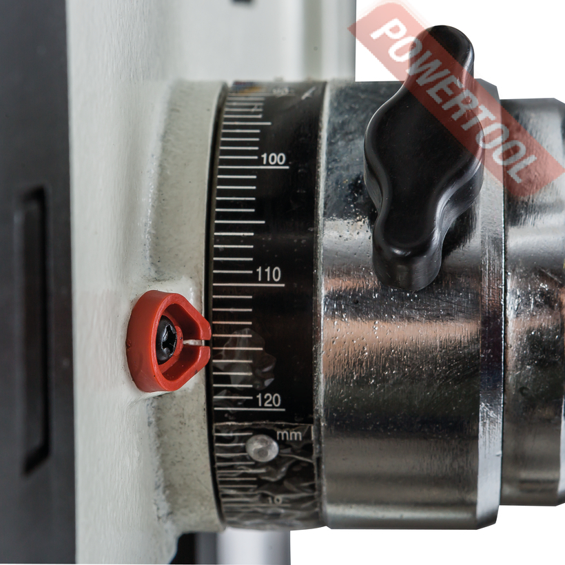 Шпиндель станка имеет конус МК-4, благодаря этому, ну и конечно двигателю мощностью 0,85 кВт, станок способен сверлить отверстия в заготовках диаметром 32 мм. Не забывайте, что при этом на станке установлен асинхронный двигатель, подключается он к сети 380В и весь момент от двигателя передается через шкивы и ремни. Всего на станке 12 скоростей от 70 до 1650 об/мин. Обратите внимание именно 70 оборотов, это самая маленькая скорость в классе. Момент огромный и на маленьких оборотах сверлить, например, чугун можно до 35 мм.