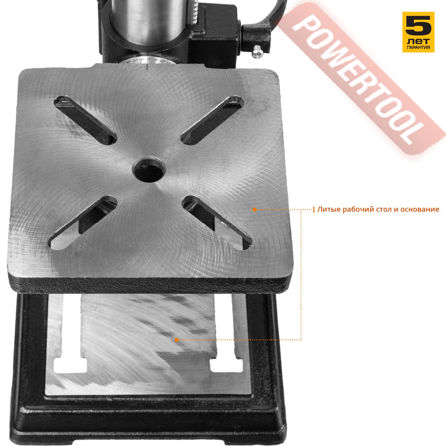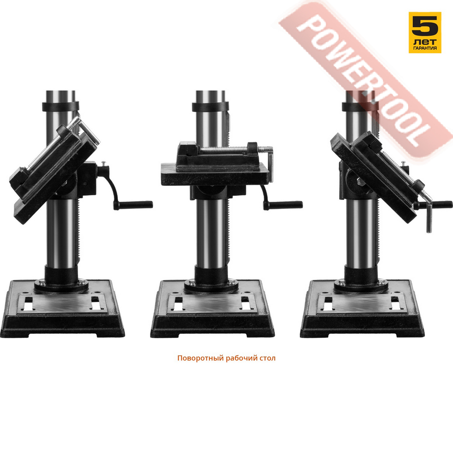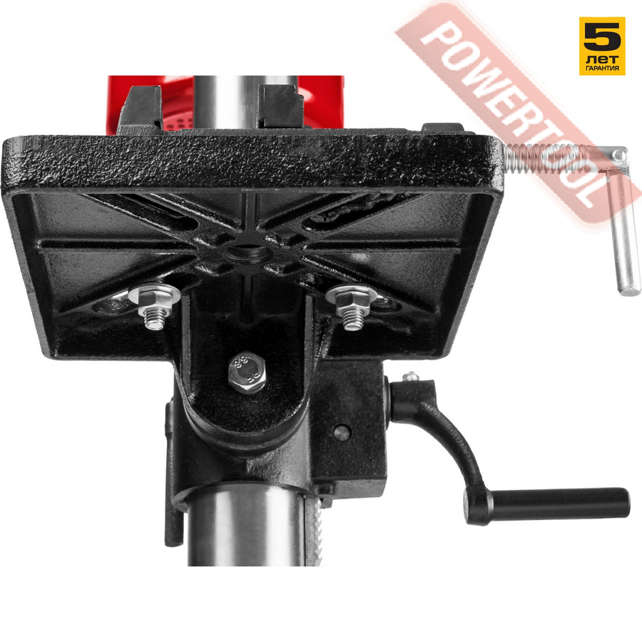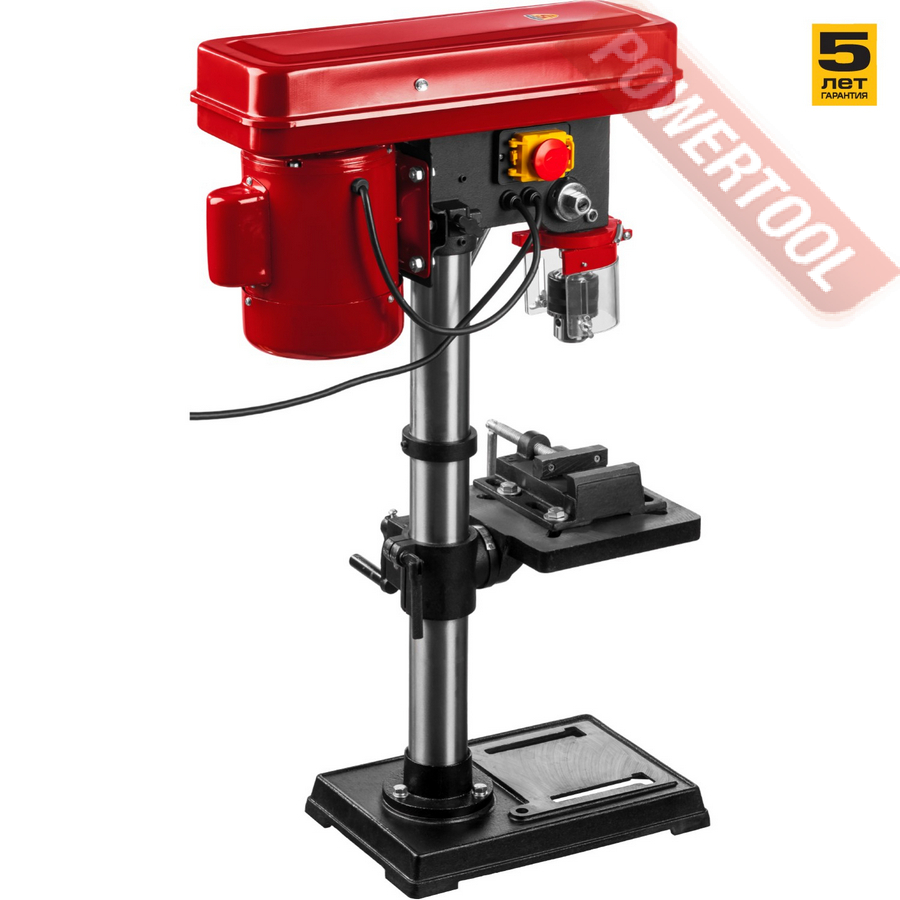 Сверлильный станок, 450 Вт, 380 В, max диаметр сверления 16 мм, частота вращения шпинделя 220-2450 об/мин, 12 скоростей, ступенчатая регулировка оборотов, конус шпинделя КМ-2, посадочное сверлильного патрона B16, диапазон хвостовиков для патрона 1,5-16 мм, ход пиноли шпинделя 50 мм, вылет шпинделя 126 мм, шпиндель-стол 350 мм, шпиндель-основание 524 мм, диаметр стойки 60 мм, размер основания 355х235 мм, размер стола 195х200 мм, наклон стола влево/вправо 45/45 градусов, 4 Т-образных паза, габариты ДхШхВ 580х300х820 мм, вес 32 кг, в комплекте патрон ключевой В16 1,5-13 мм, оправка КМ-2/В16, защитный экран, набор инструментов, тиски.