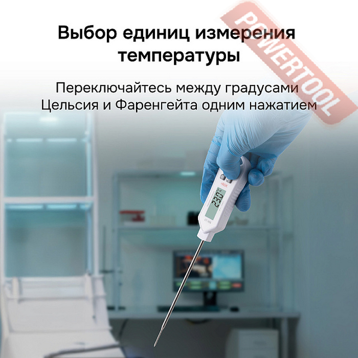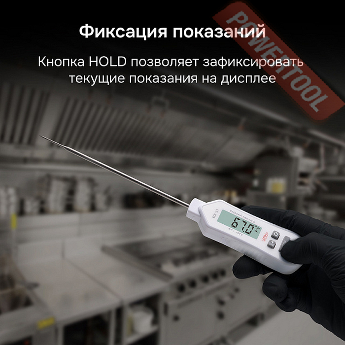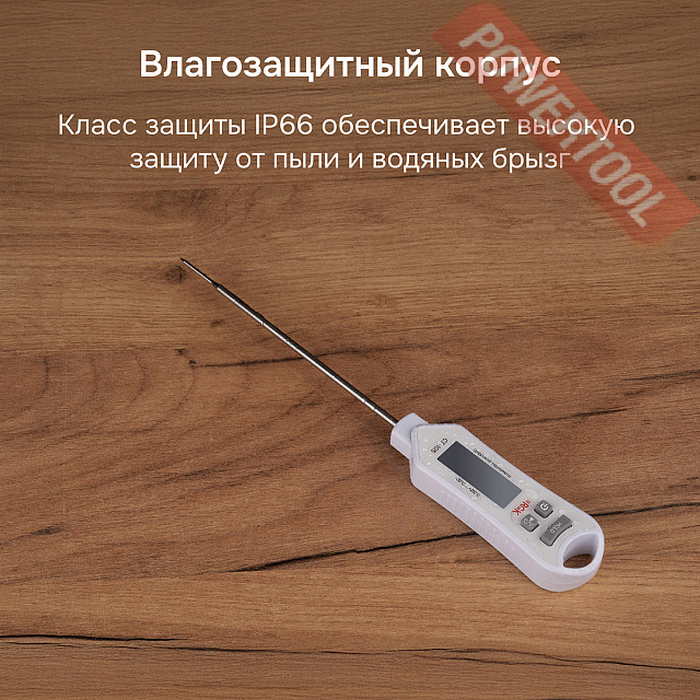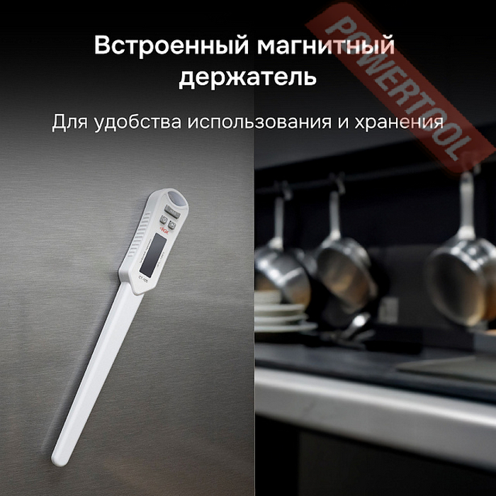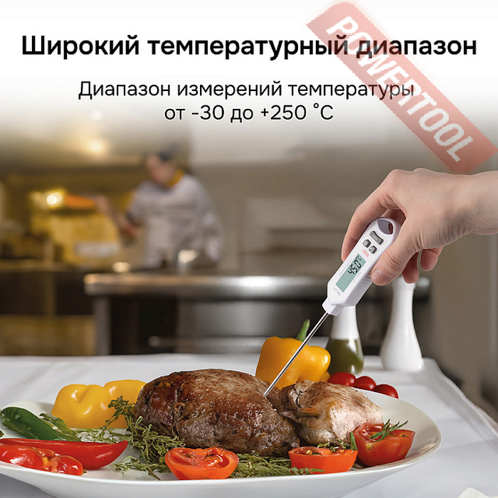 Контактный погружной пищевой термометр, внесён в госреестр СИ РФ, диапазон измерения от -30 до 250 градусов С, погрешность 2 градуса С при Т от -30 до -20 градусов С, 1 градус С при Т от -20 до 0 градусов С, 0,5 градуса С при Т от 0 до 100 градусов С, 1 градус С при Т от 100 до 150 градусов С, 2 градуса С при Т от 150 до 250 градусов С, температурное разрешение 0,1 градуса С, единицы измерения C/F, зонд NTC, длина зонда 131 мм, питание от 1 батареи 3В СR2032, защита от влаги и пыли IP66, индикатор удержания значения, магнитный держатель, габариты ДхШхВ 99х31х17 мм, вес 0,05 кг, элементы питания, поверка.