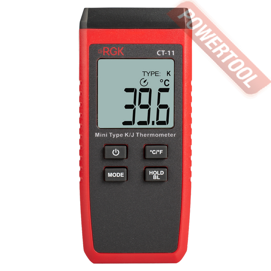 Контактный термометр с поверхностным зондом, внесён в госреестр СИ РФ, термопара типа К, диапазон измерений от -40 до 500 градусов С, погрешность 2 градуса C, разрешение 0,1 градус С, выбор единиц измерения C/F, фиксация MIN/MAX значений, расчет среднего значения, 1 канал, питание от 3 батарей 1,5 В тип ААА, индикатор удержания значения, автоотключение, габариты 120х53х28 мм, 0,082 кг, термометр RGK CT-11, поверхностная ТП модели RGK TR-01S, поверхностный зонд RGK TR-10S, элементы питания.