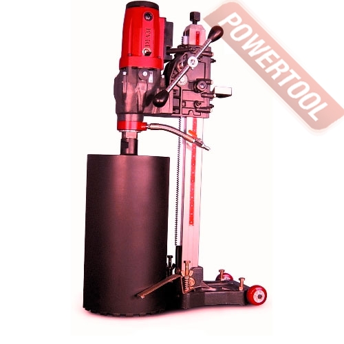Установка алмазного сверления, 3200 Вт, электрический двигатель 220 В, резьба шпинделя 1 1/4 дюйма, две скоростиь 400 / 820 об/мин, диаметр сверления 25-250 мм, стойка для бурения под углом 90 градусов, транспортировочные колеса, PRCD, защита от перегрузки, муфта скольжения, вес 25 кг.