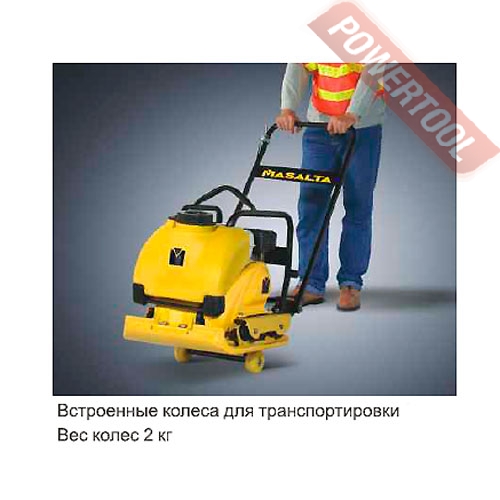 Виброплита прямого хода, вес 98 кг, рабочая поверхность 530х500 мм, усилие уплотнения 13 кН, механический привод, скорость перемещения 24 м/мин, бензиновый двигатель Honda GX160 мощностью 4,8 л.с., топливный бак 3,1 л, расход топлива 1,4 л/ч, емкость картера 0,6 л, размер 1100х500х830 мм, в комплекте транспортировочные колеса, защитная рама, приобретается отдельно система орошения с баком для воды с системой орошения, резиновый коврик для плитки.