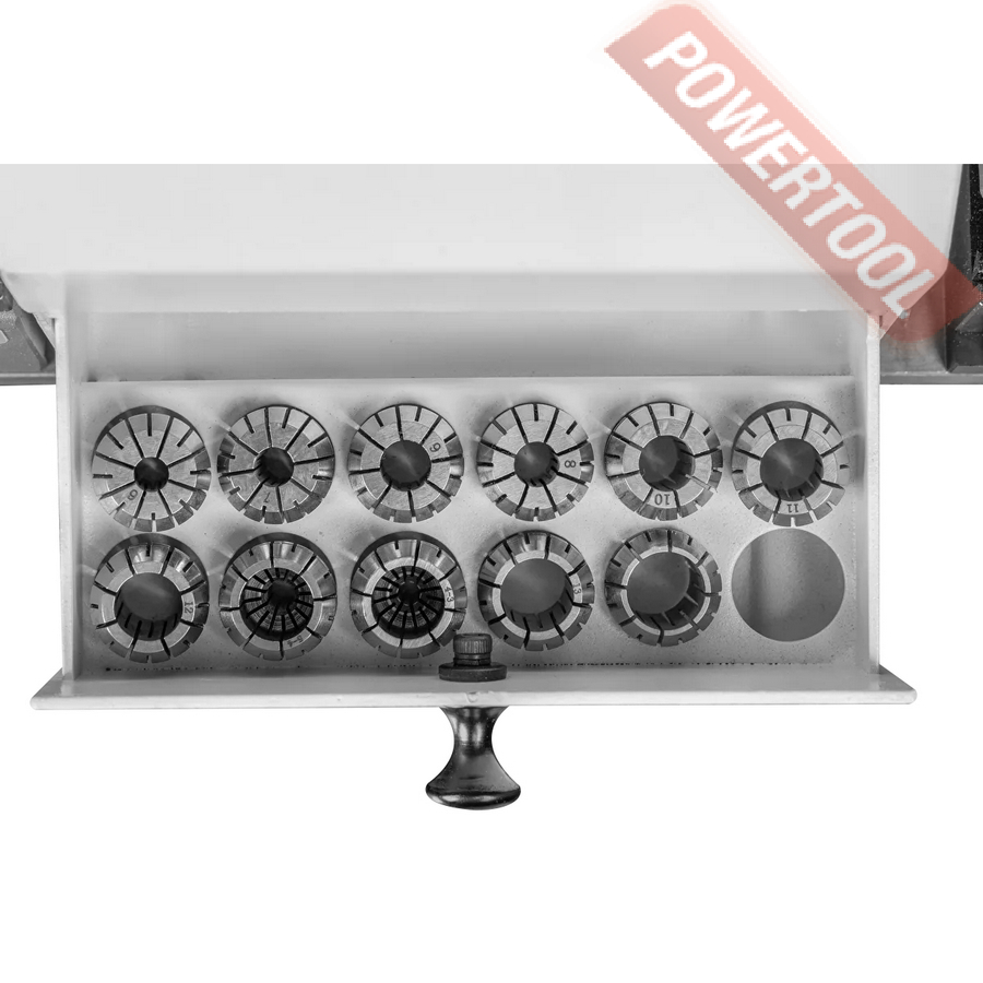 - Компактная конструкция со встроенным ящиком для хранения цанг.